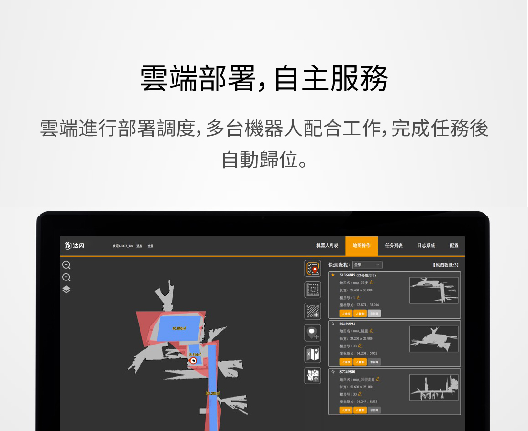 雲端進行部署調度,多台機器人配合工作,完成任務後自動歸位。